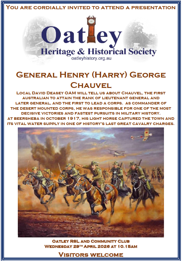 The Oatley Heritage and Historical Society researches historical events and places within and around Oatley. We also look at those things that have been left by our forebears that add to the heritage of Oatley. Arguably, many of our monuments such as the Cenotaph and Oatley Clock may not be old enough to be considered “historical” but they certainly do have “heritage” characteristics and add to the general ambience of the Suburb.